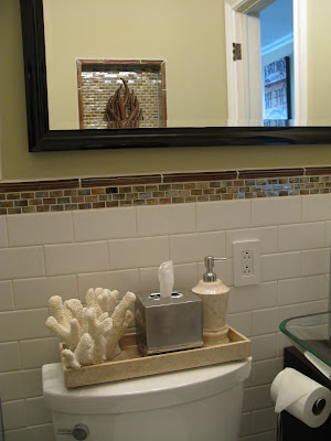 We took advantage of the empty wall opposite the vanity by adding a focal point that will come as a surprise for visitors.  The door opens into this wall so as soon as they step in to the space and close it behind them they will see a large niche covered in more of the iridescent glass subway tile, framed out in glass bars, with a wooden tree sculpture.  You know, every room should have interest, including the bathroom.